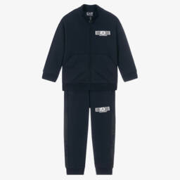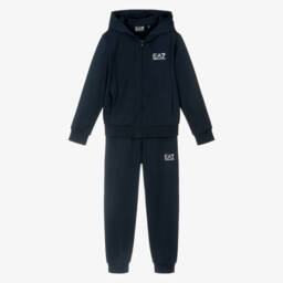 Cool and casual, a black cotton-blend tracksuit for boys by EA7 Emporio Armani. Made in mid-weight jersey with a fleecy-soft interior, both pieces have a gold rubberised EA7 logo print on the front. The hoodie has a front pouch pocket, whilst the cuffed joggers have side pockets and an internal drawstring for a comfortable fit.
