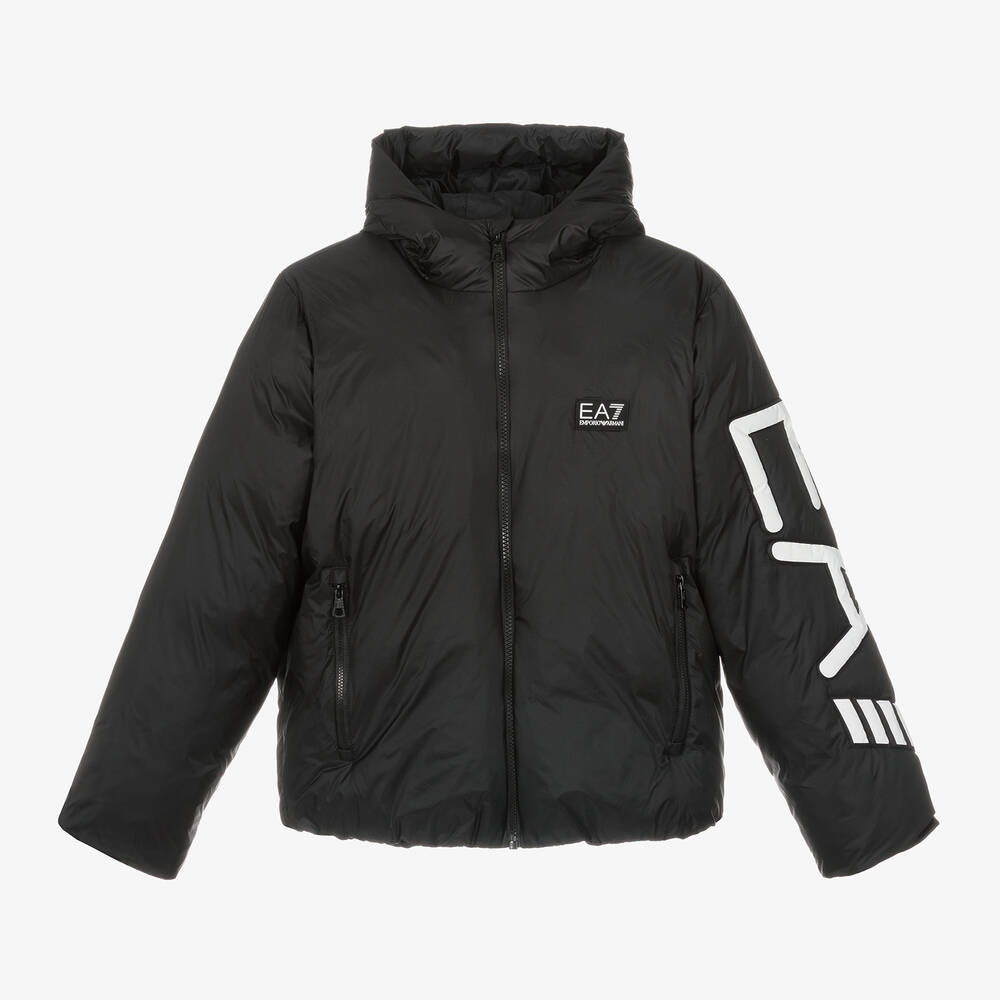 A black puffer jacket for boys by EA7 Emporio Armani, made and lined in silky fabric. The brand's EA7 logo patch is stitched on the front and a stand-out graphic is printed on one sleeve in white, adding those signature designer elements. This hooded jacket fastens with branded zips on the front and pockets. Mid-weight padding and fleece-lined pockets offer warmth and comfort.