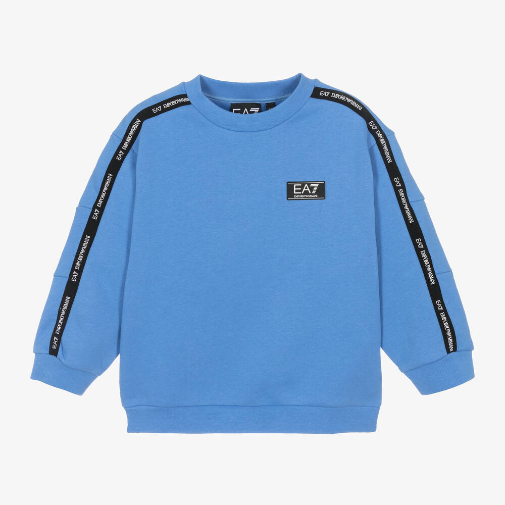 Sky blue cotton jersey sweatshirt for boys by Italian sporty brand EA7 Emporio Armani. Instantly recognisable, it has the designer's EA7 rubberised patch on the chest and black logo tape down the long sleeves. Casual and comfortable, this relaxed fit top has a cosy fleecy inside and ribbed trims.