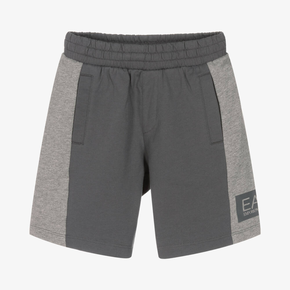 Comfortable grey shorts for boys by EA7 Emporio Armani, made in the softest cotton jersey. In a cool two-tonal design, a distinctive EA7 logo is printed on the side for instant recognition. There are comfortable pockets, with an internal drawstring waist to adjust as your child grows.