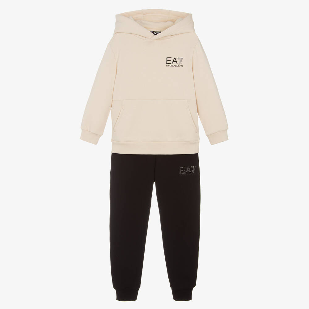 Cool and casual, an ivory and black cotton-blend tracksuit for boys by EA7 Emporio Armani. Made in mid-weight jersey with a fleecy-soft interior, both pieces have a black rubberised EA7 logo print on the front. The hoodie has a front pouch pocket, whilst the cuffed joggers have side pockets and an internal drawstring for a comfortable fit.