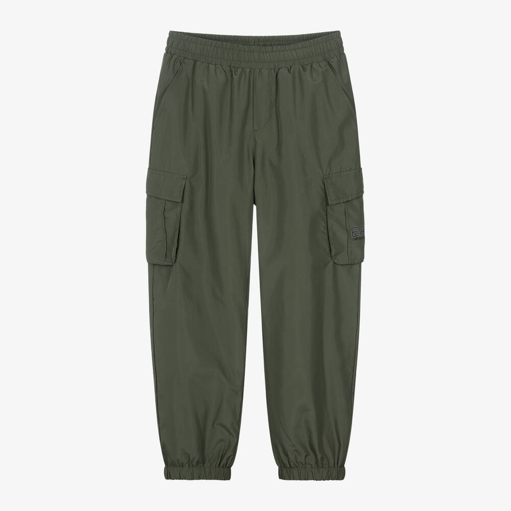 Khaki green cargo trousers for boys by EA7 Emporio Armani, made in silky smooth fabric with a mesh lining. Cool and casual, these lightweight trousers have an inner drawstring on the waistband and elasticated cuffs on the ankle. The roomy leg pockets, one of which is branded with a striped EA7 logo, fasten securely with poppers for extra convenience.