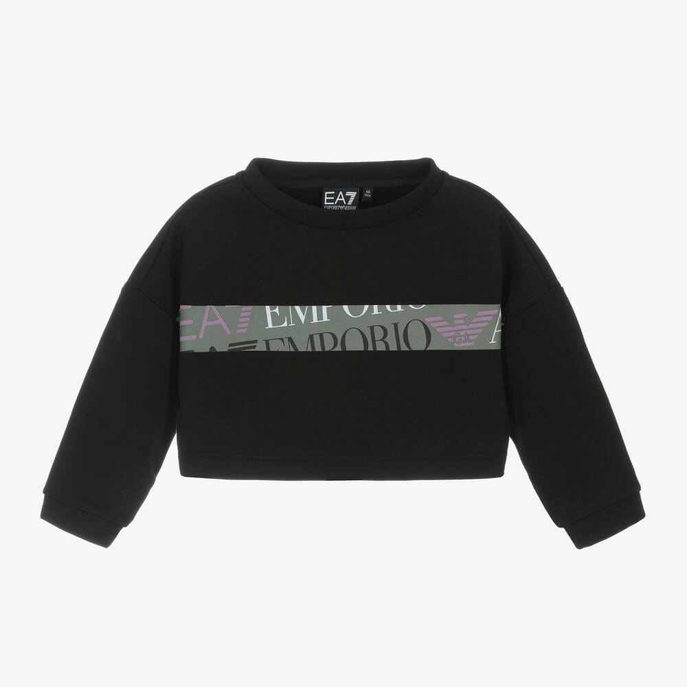 Black sweatshirt for girls by EA7 Emporio Armani, made in comfortable cotton jersey with a soft, fleecy inside. In a stylish boxy fit, this casual top has dropped shoulders and is cropped to sit on the waist. For a distinctive look, a khaki green stripe on the front incorporates the designer's logo, with a smaller EA7 purple print on the back adding an extra branded touch.