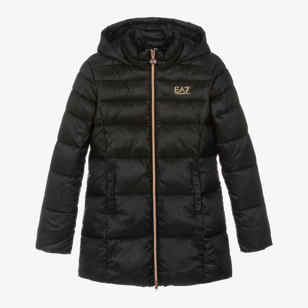 Black puffer coat for girls by EA7 Emporio Armani, made and lined in a silky smooth fabric. Both stylish and practical, this warmly padded coat has a fixed hood and fleece lined pockets for an extra cosy feel. The Italian label's signature EA7 logo is printed in rose gold on the chest and to complete the stylish designer look, it fastens with a shiny, branded zip on the front.