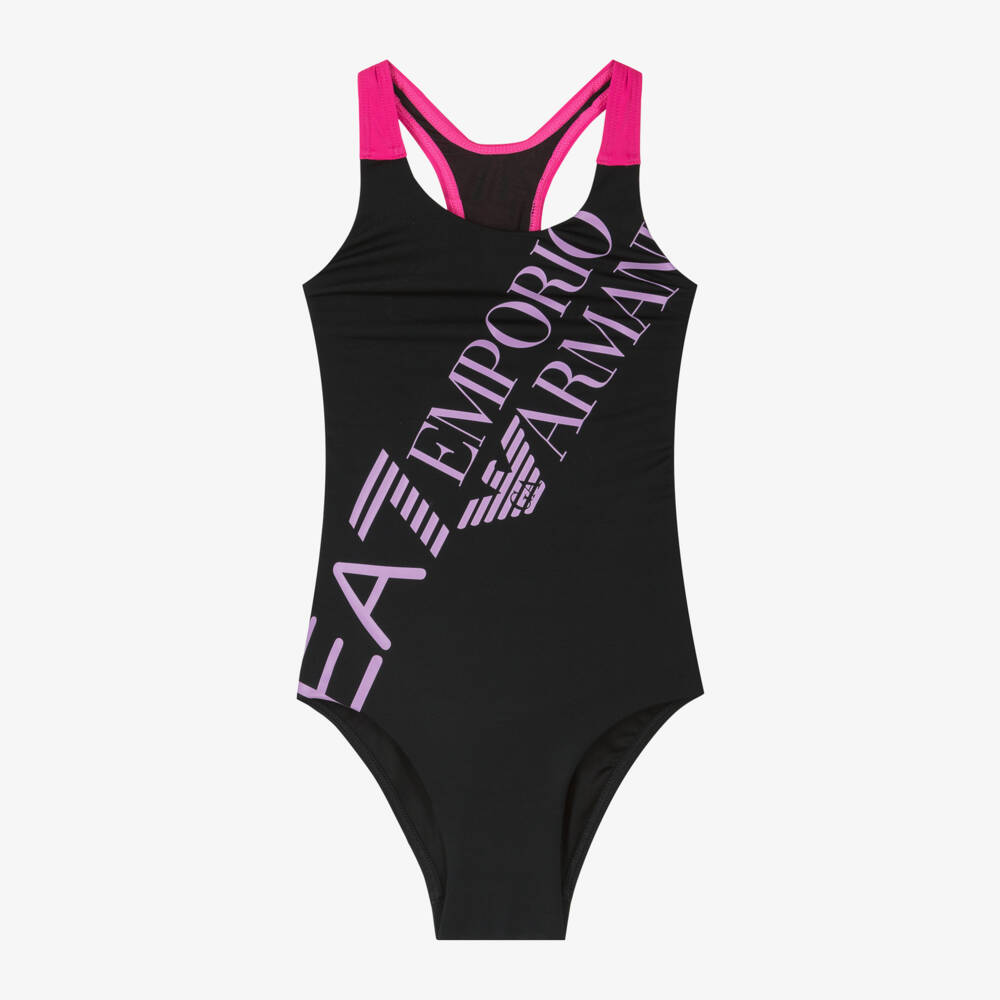 Black swimsuit for girls by EA7 Emporio Armani, with contrasting pink trim on the shoulder straps. Made with recycled fibres, this silky smooth and stretchy swimsuit is fully lined for comfort and has a stylish racer back with open detail. The designer's EA7 logo can be seen on the front in purple print for an eye-catching designer finish.