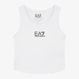 A black Mini-me sports bra top for older girls by EA7 Emporio Armani, with a bold white logo on the front. Breathable and quick-dry, the Vigor7 technical fabric offers optimum performance during intense workouts through a compression technique that reduces muscle vibration and increases endurance. This racerback-style also has anti-abrasion seams for extra comfort.