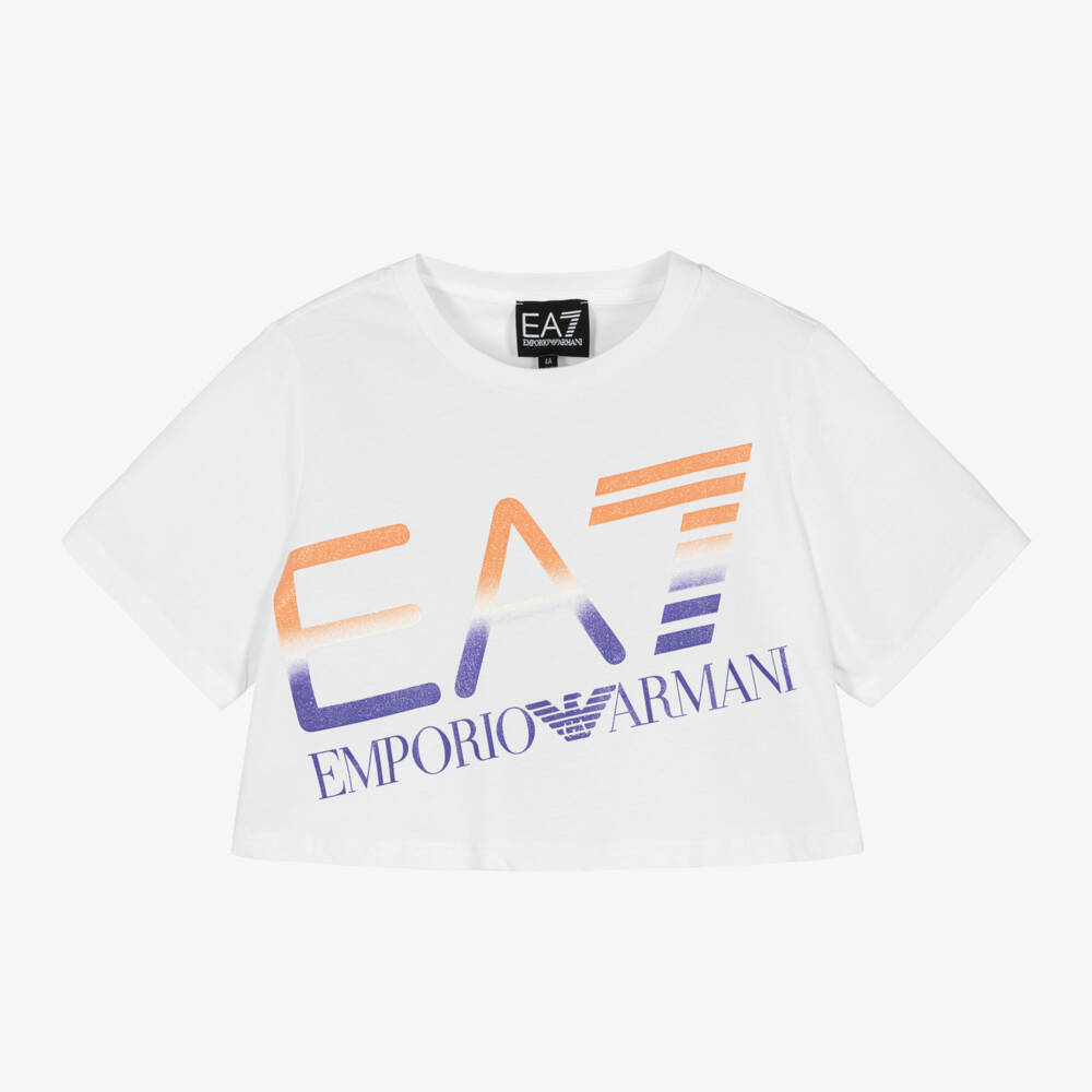 Cropped white T-shirt for girls by EA7 Emporio Armani, made in soft and comfortable organic cotton jersey. This short-sleeved top has a contemporary boxy fit and is finished with a glittery logo in gradient orange and purple print, for instant designer appeal.