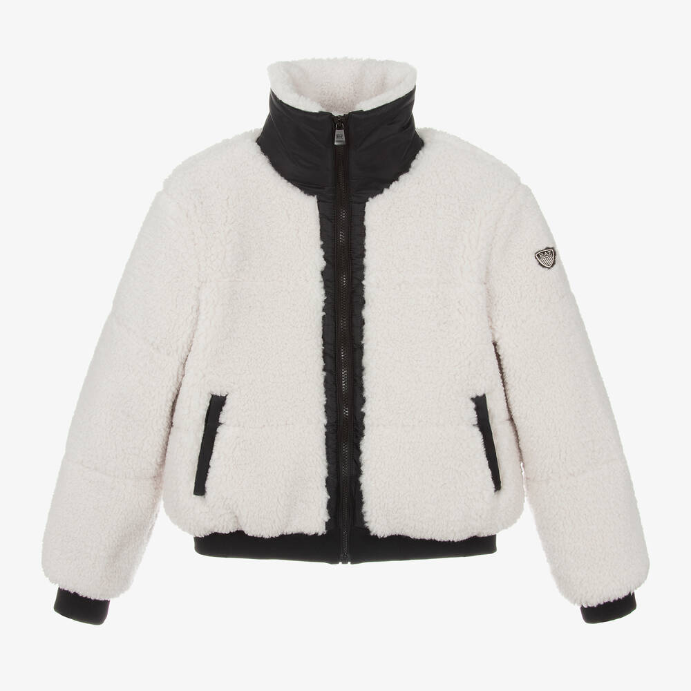 An ivory jacket for girls by EA7 Emporio Armani, made in soft teddy fleece and lined in silky fabric. With black trims for a cool colour contrast, this signature outerwear piece is signed with the Italian label's EA7 logo patch on one sleeve. It has a stand-up collar, popper-closing pockets, and a branded zip fastening on the front. The lightweight padding, fleece-lined pockets, and ribbed cuffs help keep her warm and comfortable.