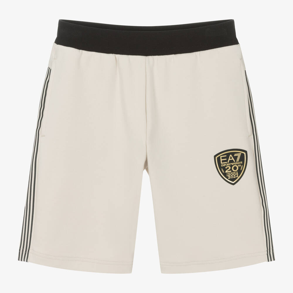 Light beige shorts for teen boys from EA7 Emporio Armani, with handy side pockets. Trimmed with stripes for that sporty feel, these cool, football-inspired shorts have a crest logo print on the front in black and shine-effect gold, a design to commemorate the Italian label's 20th anniversary. They are made in super-soft, cotton-mix Milano jersey and designed with an elasticated, inner-drawstring waist for the best fit.