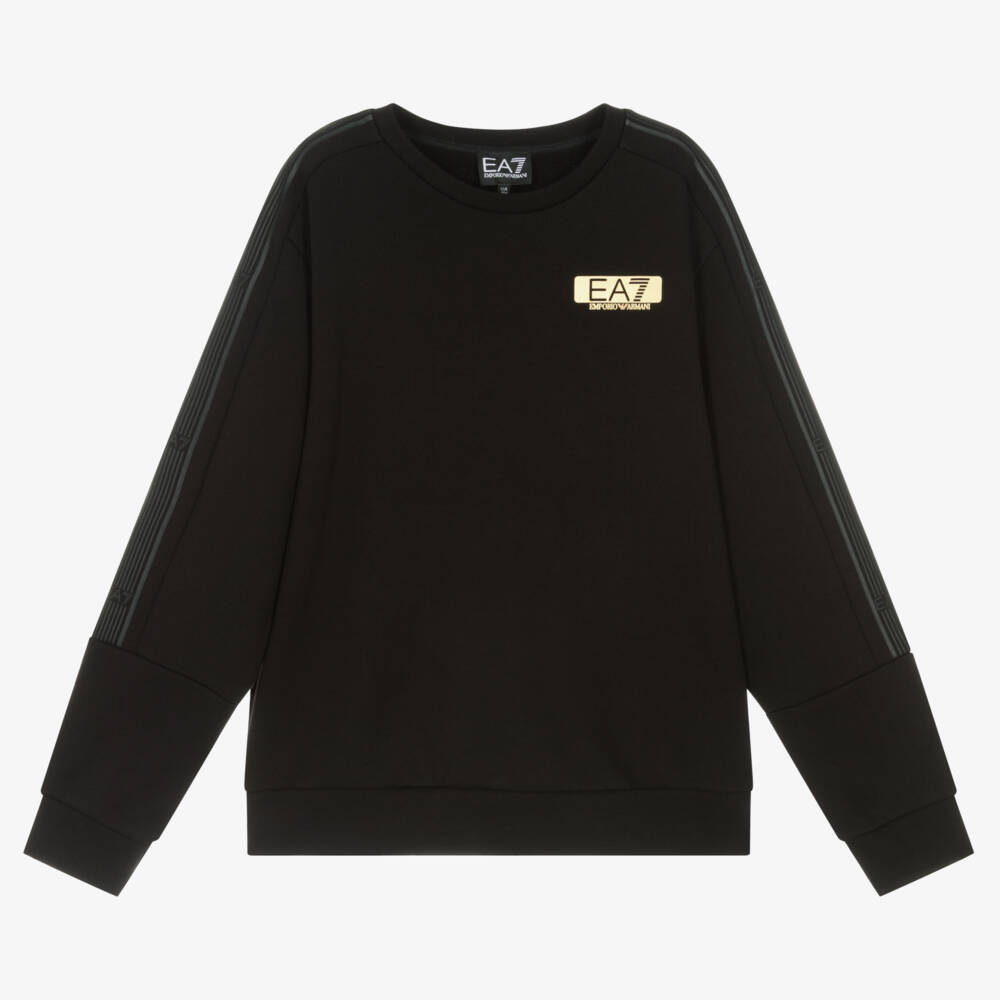 Black sweatshirt for teen boys by Italian brand EA7 Emporio Armani, with a gold EA7 logo printed on the chest. Comfortable to wear, it is made in soft, mid-weight cotton jersey with a warm, fleecy inside. There are tonal rubberised 7 lines logo trims on each sleeve for a sporty designer finish.