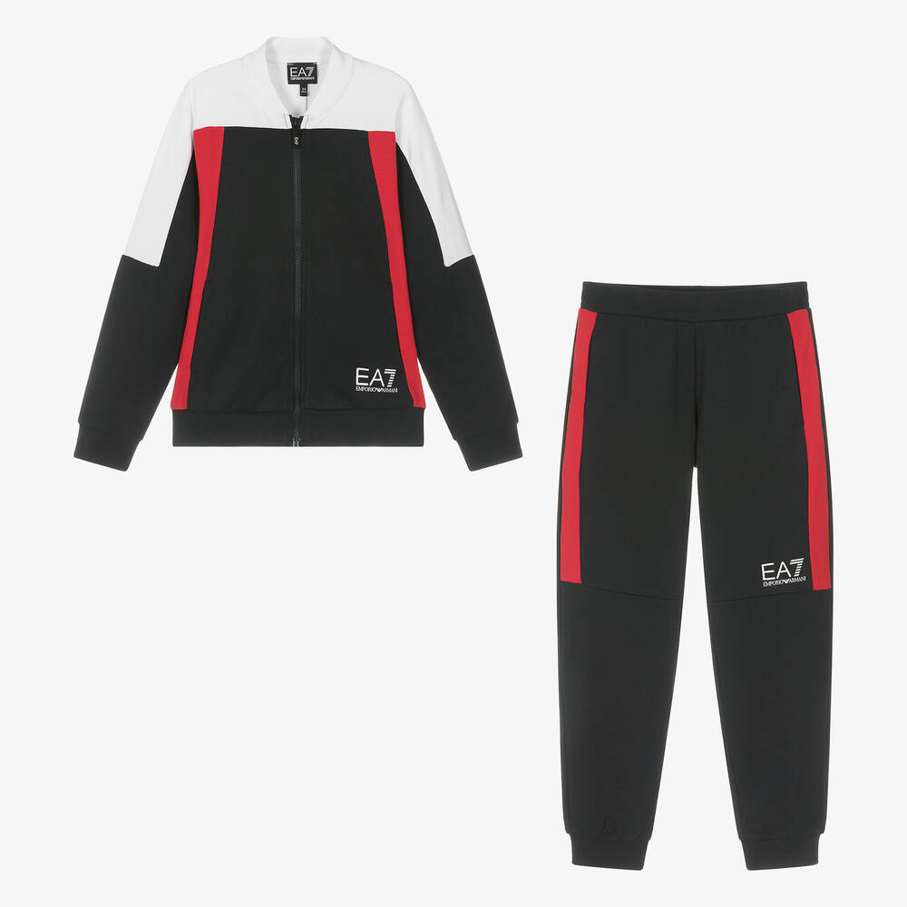 From Italian brand EA7 Emporio Armani, this dark navy blue tracksuit is designed for teen boys. Great for sporty athleisure looks, the long-sleeved top has a contrast white panel across the shoulders and red block trims on the front. Two front pockets are neatly concealed and the zip pull tab is stamped with recognisable white branding. For a complete look, the matching joggers have lightly ribbed cuffs and a drawstring fastening hidden inside the waistband. This designer tracksuit is branded with white EA7 logo prints which draw the eye.