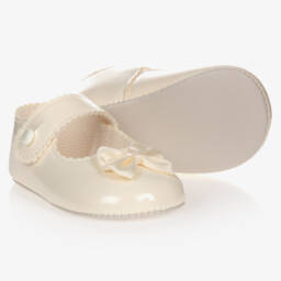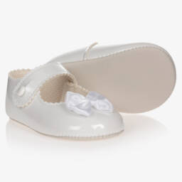 Black pre-walker shoes by Early Days Baypods, made in soft faux patent leather with pretty satin bows on the toes. They have a flexible sole and a comfortable lightly padded insole, with a button fastening strap.