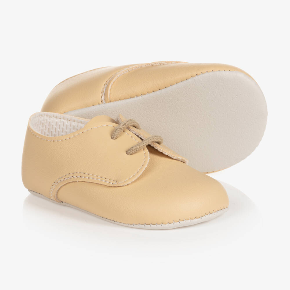Beige pre-walker shoes for baby boys and girls from British brand, Early Days Baypods. Made in soft faux leather with a textile lining, they fasten with laces for a smart look. Ideal for developing feet, they have a lightly cushioned insole and a comfortable flexible sole.
