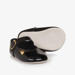 Early Days ivory pre-walker shoes made from synthetic, patent faux leather with cute gold bows on the front. Made in a classic style with a buckle fastening, and a soft padded insole and absorbent lining.