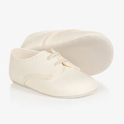 Ivory pre-walker shoes for baby boys and girls from British brand, Early Days Baypods. Made in soft faux leather with a textile lining, they fasten with laces for a smart look. Ideal for developing feet, they have a lightly cushioned insole and a comfortable flexible sole.