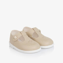 Ivory first walker shoes for little boys and girls by Early Days Baypods, in a classic T-bar design with a perforated pattern on the front for a traditional look. Ideal for taking those first little steps, these comfortable shoes are made in soft faux leather, with a gently cushioned textile insole. They fasten easily with a button and have a flexible, rubber outer sole for good grip and support.