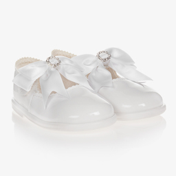 White first walker shoes for little girls by Early Days Baypods, made in soft patent faux leather. They have a soft flexible sole and a comfortable lightly padded insole, with large ribbon bows and diamanté trims.