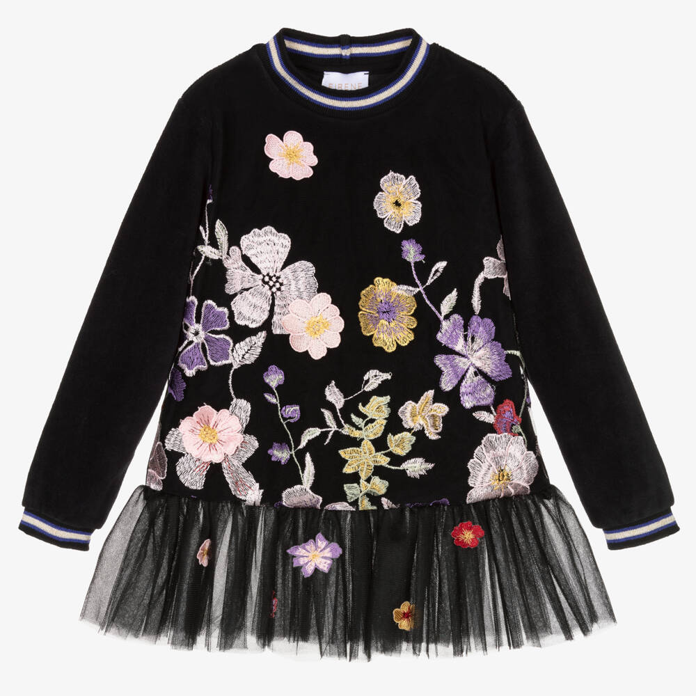 Lovely black floral dress for girls by EIRENE, made in a soft cotton velour with a tulle overlay and skirt. Gorgeous floral embroidery and floral appliqués decorate the front, giving a glamorous twist to a comfortable, casual piece. The layered tulle skirt adds a pretty girly touch and the stretchy ribbed striped trims, shimmer with gold glitter for a sparkling finish.