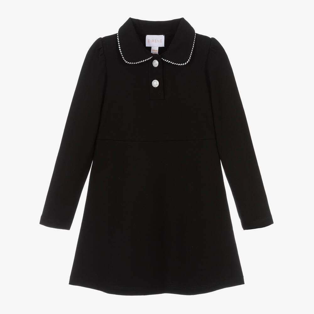 Girls black dress by EIRENE, made in soft viscose blend jersey for comfortable wear. In a simple yet stylish design, this long-sleeved dress has gently gathered shoulders and a skater-style flared skirt. The smart collar has a contrasting white trim and to complete the look, and it fastens with embossed white buttons on the front.