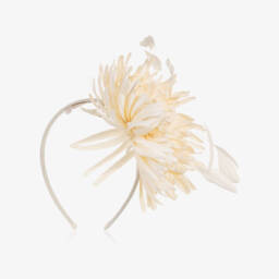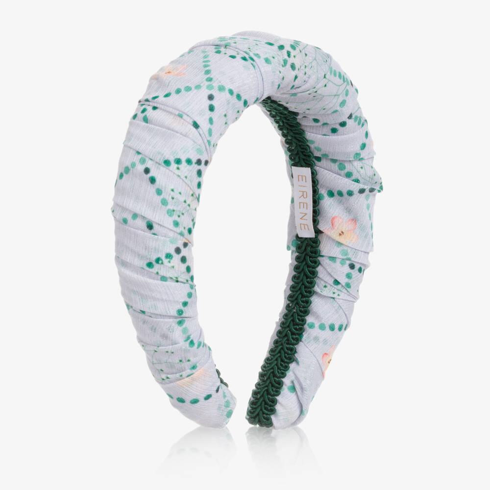 Girls beautiful hairband by Eirene. In a delicate shade of pale blue with a green criss-cross and abstract floral pattern, this lovely hair accessory has a delicate shimmer to the chiffon fabric and a soft, padded feel.
