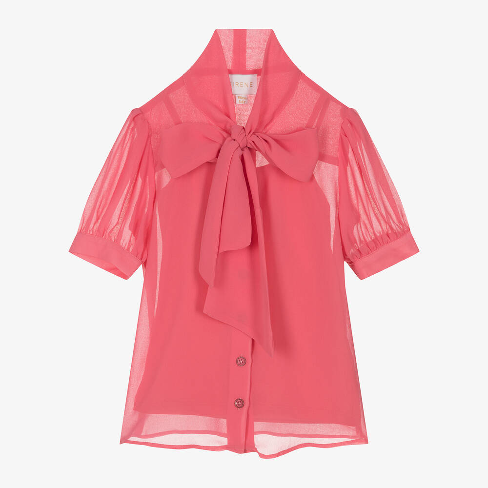 Gorgeous coral pink blouse for girls by EIRENE, made in chic crêpe chiffon using recycled materials. This smart blouse has short sleeves with a puffed effect and a tie-up bow around the neckline for effortless sophistication. The separate vest lining is made in soft cotton jersey, and beautifully pairs with the top for modesty and comfort. It fastens with pink buttons on the front for a simple, understated finish.