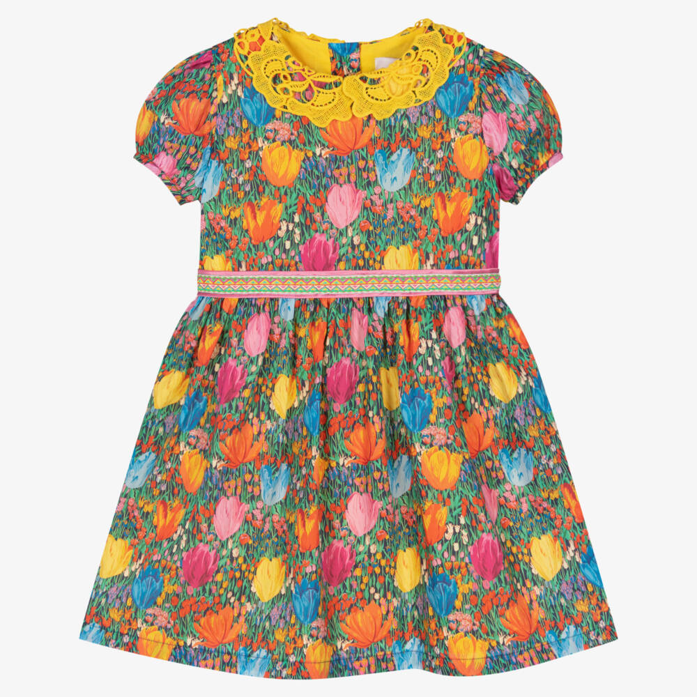 Patterned in a colourful array of gorgeous tulips, this vibrant Liberty print dress for girls is by Eirene. Suitable for a smart occasion, it has elegant puffed sleeves, a beautiful cutwork embroidery collar, and a colourful geometric-patterned waistband. Woven in luxurious Tana Lawn cotton and lined in lightweight voile, the dress fastens with pink buttons on the back.