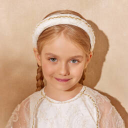 A glittery gold hairband for girls by EIRENE, ideal for adding a touch of sparkle to a special occasion outfit. This elegant accessory features a dazzling gold glitter finish and a charming bow on the side. The flexible band is covered with fabric and sits comfortably on the head.