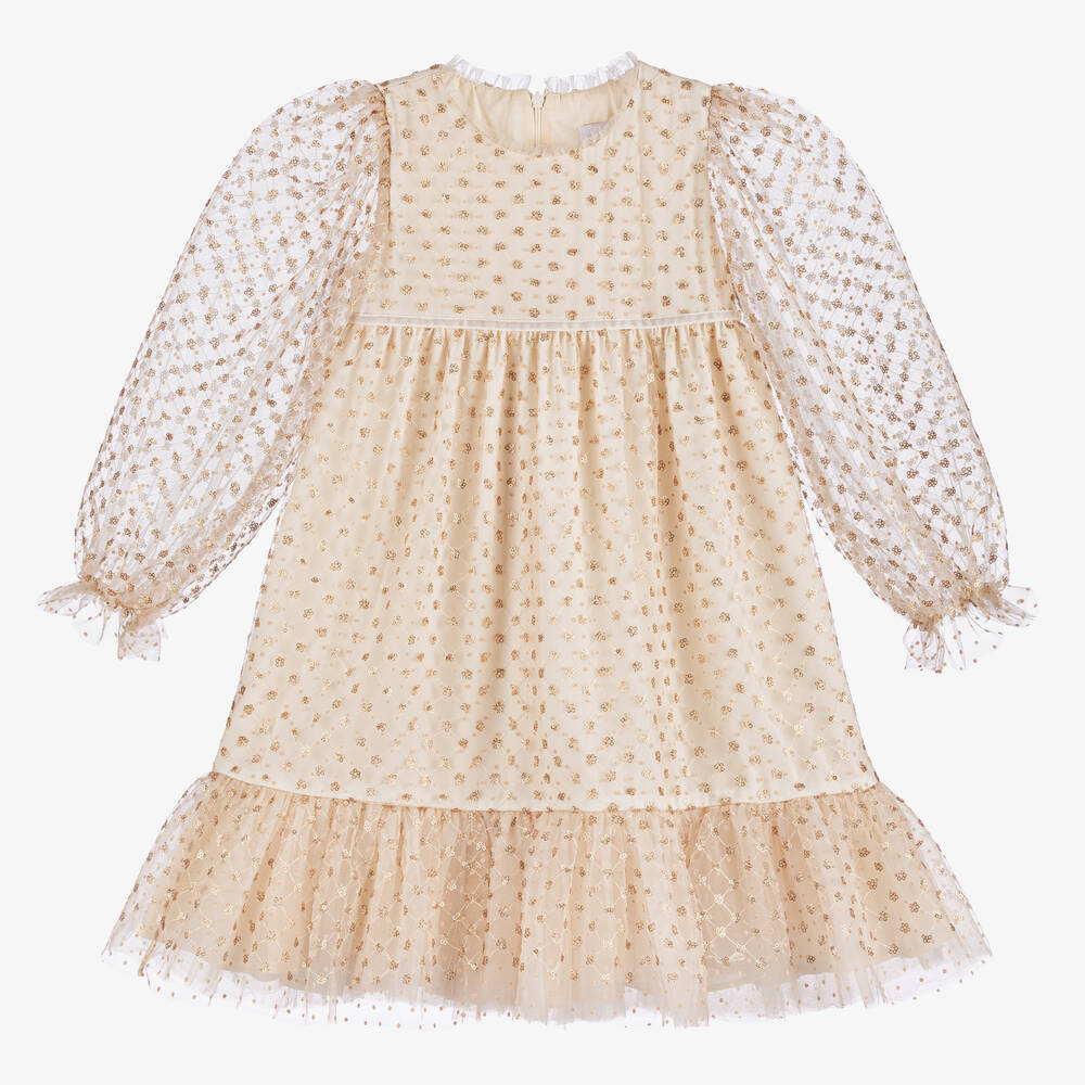 Eye-catching gold sequinned dress for girls by EIRENE, ideal to shimmer and shine in at any special occasion. It is made in lightweight ivory crêpe, with a tulle overlay patterned in flocked polka dots and an embroidered lattice pattern glittering with flower-inspired gold sequins. There is a stand-up ruffle collar, prettily puffed, sheer, long sleeves with gently elasticated, frilled cuffs and a deep ruffle around the hemline. The empire line bodice is trimmed with ivory velvet and the dress fastens with a concealed zip on the back. It is fully lined in cotton voile for comfort.
