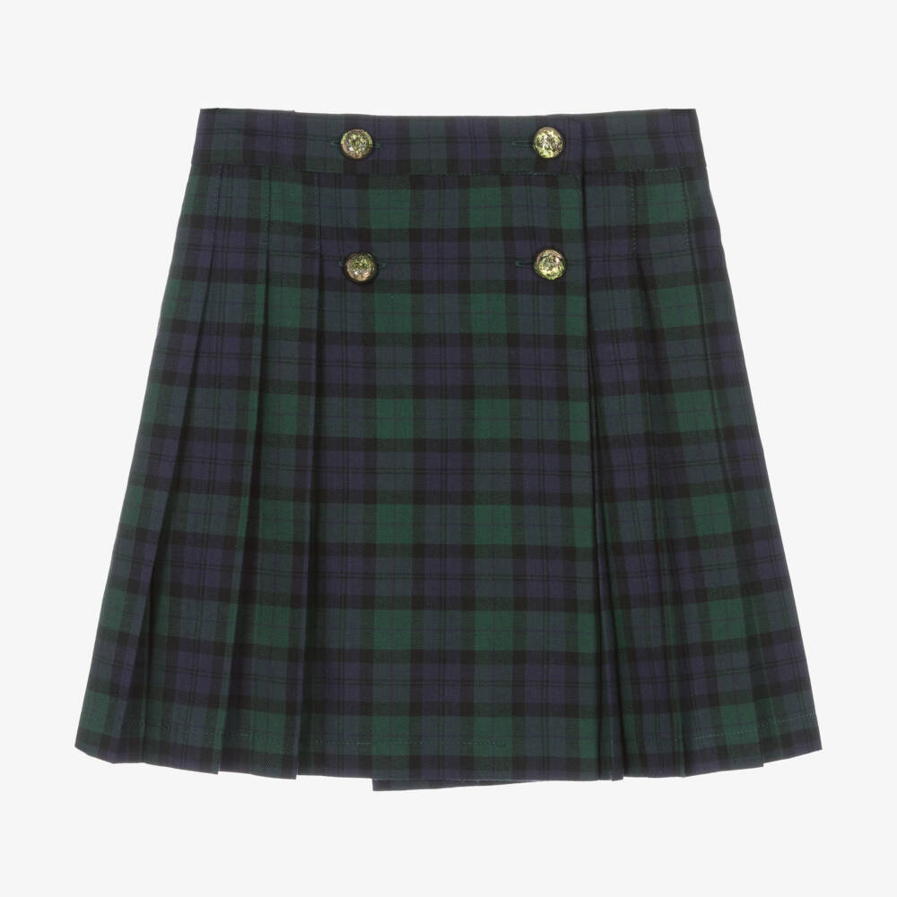 Green and navy blue tartan skirt for girls by EIRENE, woven in a soft cotton blend. Fastening with a zip on the back, this pleated style has a classic crossover front with iridescent button fastenings. It is cut to a regular fit, sits just above the knee, and is fully lined with cotton voile for added comfort. The adjustable waist can be altered for a suitable fit.