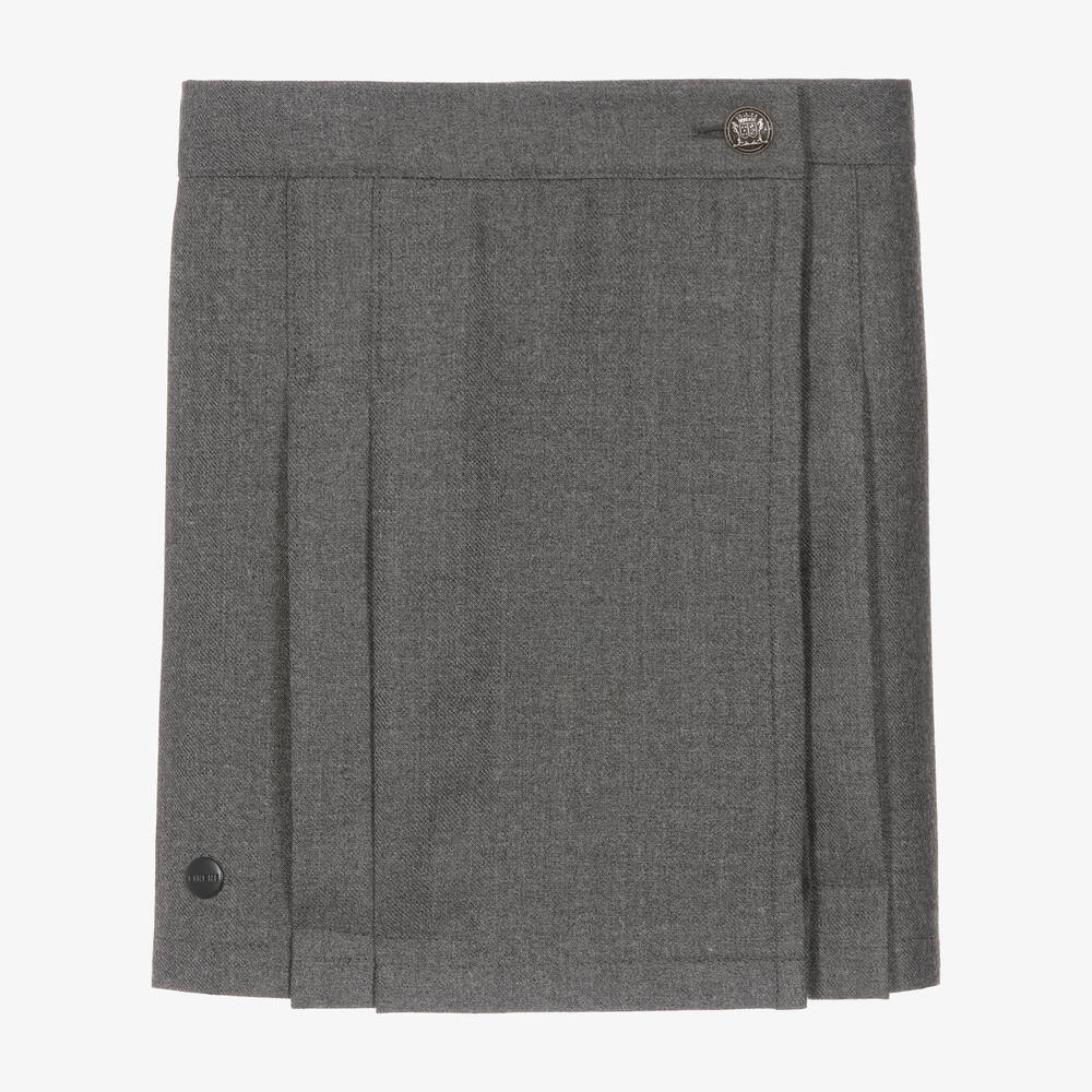 Smart and stylish grey skirt for girls by EIRENE, made in soft cotton blend flannel. This charming kilt-style skirt has pleats on the sides and a logo pin by the hem. Easy to wear, it simply wraps around and fastens on the front with a button decorated with a coat of arms. There is an internal button fastening and a useful adjustable waist to ensure a good fit.