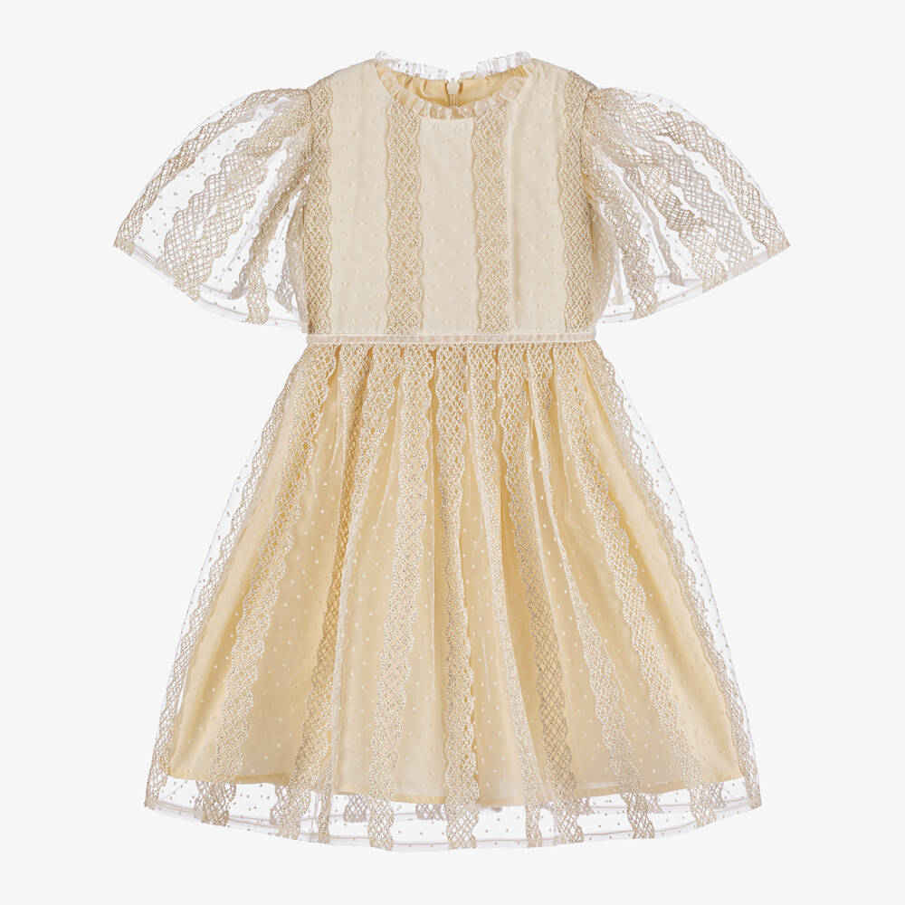 Gorgeous ivory dress for girls by EIRENE, made in soft spotted tulle decorated with glittery ivory and silver lace panels for added sparkle. Ideal for a special occasion, it has a sweet ruffle around the neck, sheer short sleeves and an ivory velvet trim around the waist. Fully lined for comfort , there is an additional chiffon lining on the bodice for a contrasting look. This striking dress fastens neatly on the back with a concealed zip.