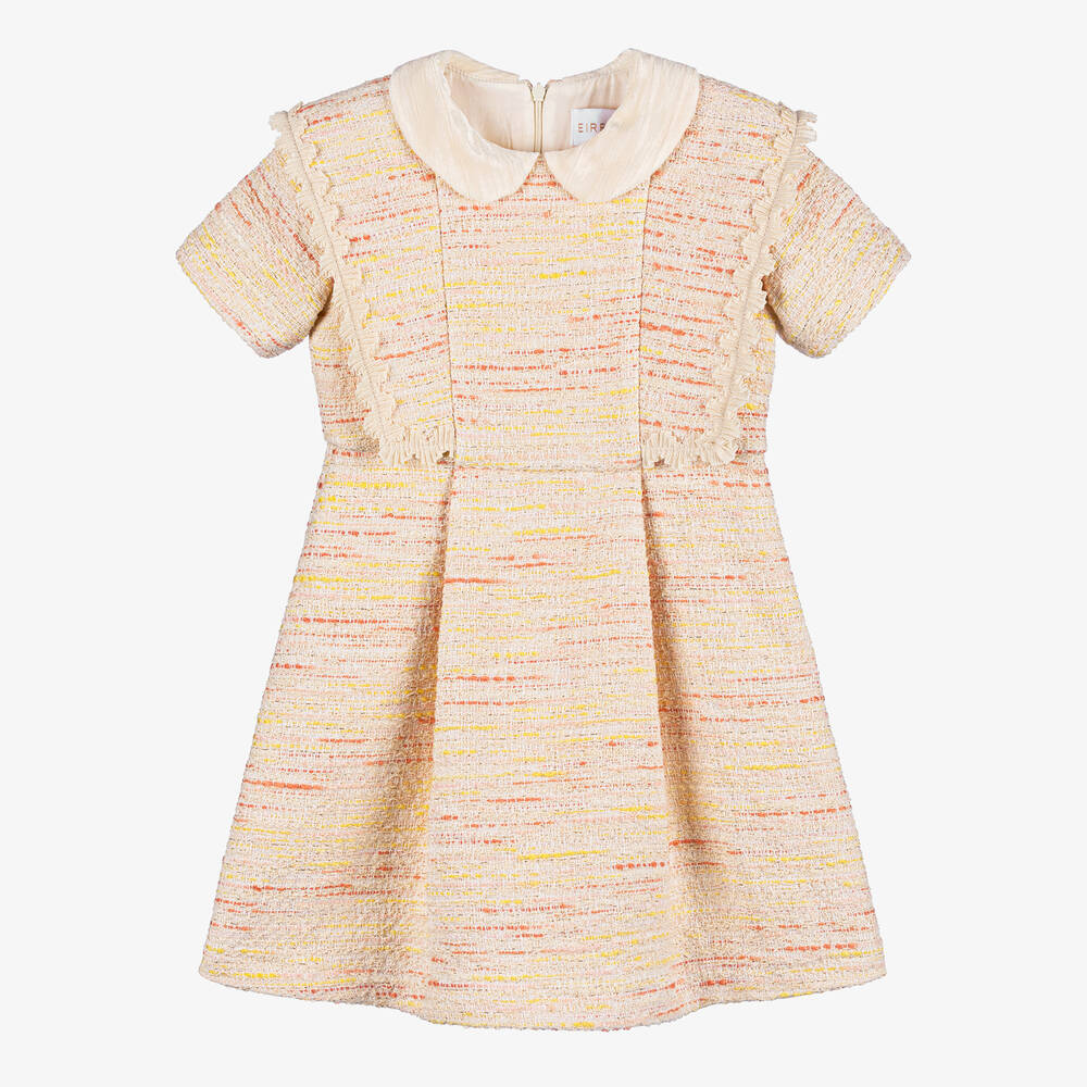 A gorgeous tweed dress for girls by EIRENE, woven with yellow and coral pink yarn to create that distinctive, textured look. This short-sleeved dress has a gently ridged velvet collar and flecks of metallic gold shimmer throughout the ivory fabric. A ruffled trim surrounds the layered bodice and a single box pleat on the skirt adds fullness from the waist. The bodice is lined with soft cotton voile and on the back, is a neatly hidden zip.