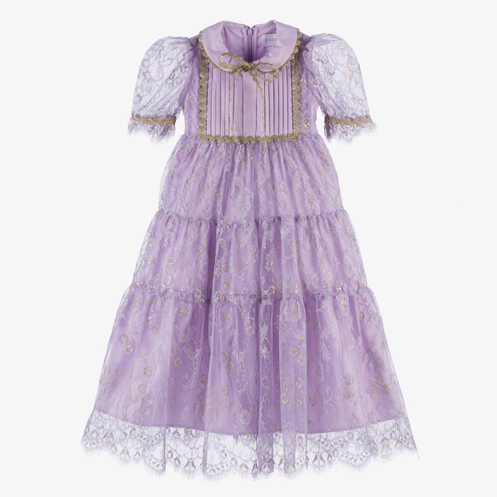 A timeless lilac purple special occasion dress for girls by EIRENE, exclusive to Childrensalon. Made from lightweight lace with gold metallic detailing, it has a smooth cotton lining for added modesty and comfort. Sweet and enchanting, it is embellished with a gold ric rac trim on the Peter Pan collar, around the pleated panel on the chest, and on the cuffs of the sheer puffed short sleeves. Ideal for a delightfully feminine style, it fastens with a concealed zip on the back for a discreet finish.