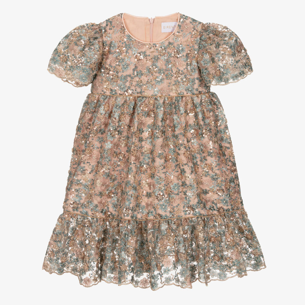 Stunning pink tulle dress for girls by EIRENE, with pink and blue floral embroidery shimmering with gold sequins. Ideal for any special occasion, it has pretty puffed sleeves, lined with soft tulle and scalloped gold embroidered trims for a pretty finish. For added comfort, it is lined with a soft cotton voile and fastens neatly on the back with a concealed zip.