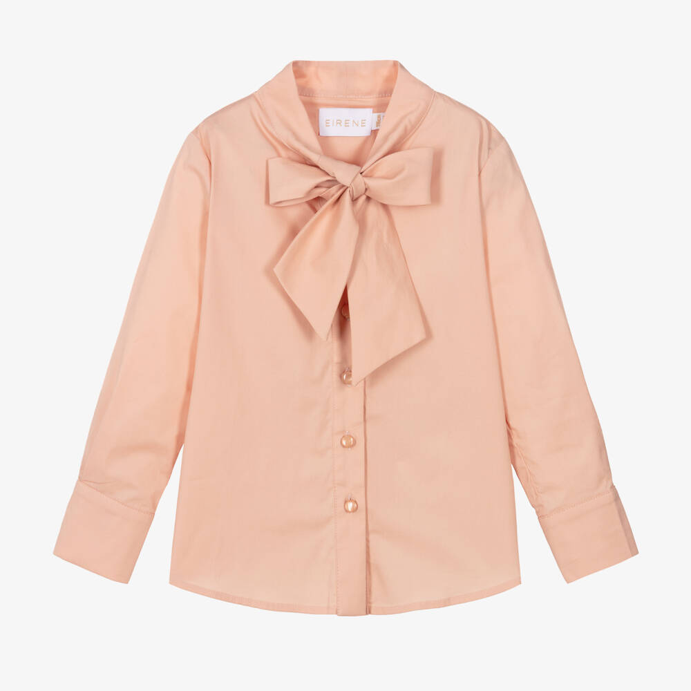 A smart pink blouse for girls by EIRENE, with an elegant bow on the front. Woven in luxuriously soft cotton, it fastens with pearlescent buttons on the front and on the cuffs. A pleated detail on the back allows for comfortable movement.