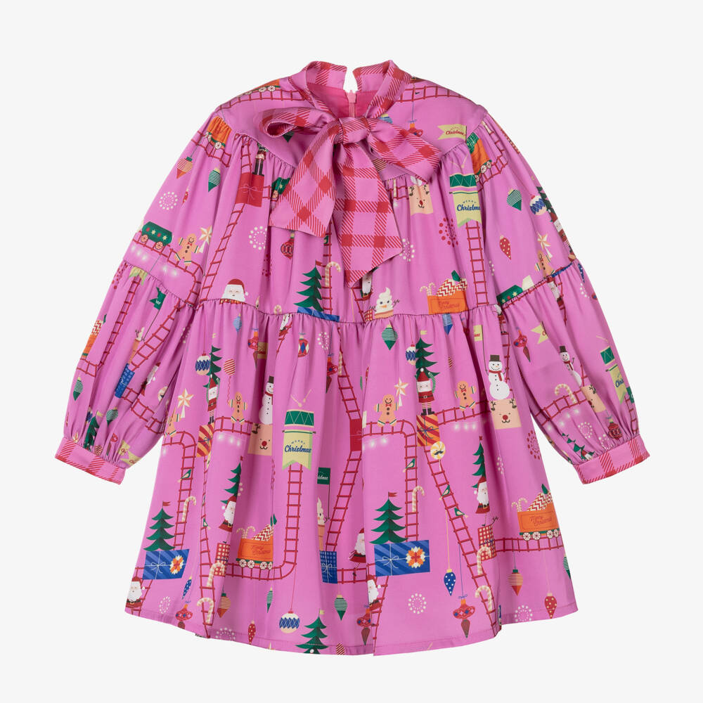 A fabulous pink dress for girls by EIRENE with a dramatic tiered trapeze silhouette. Smooth and silky, this long-sleeved dress has a fun Christmas-themed pattern, featuring, Santa Claus, presents, snowmen, and baubles. Fully lined, it has a tonal check necktie that can be tied into a pretty bow. The concealed zip fastening on the back gives an elegant finish.