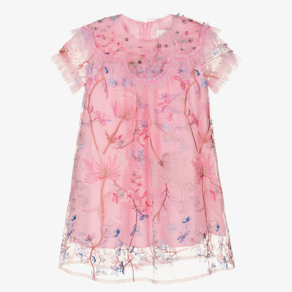 Gorgeous pink tulle dress for girls by Eirene, beautifully embroidered with pink, blue and silver floral embroidery. It has a large, scalloped tulle collar, sparkling with pink and blue gems and trimmed in a beaded tulle frill. Fully lined in lightweight pink cotton, it has frilled sleeves and fastens with a neat, concealed zip around the back.