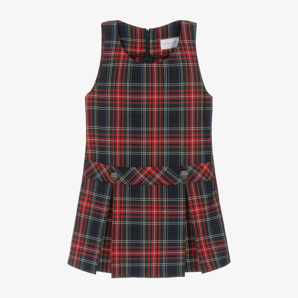 In a red and navy blue tartan check, this stylish dress for girls by EIRENE is made in a soft cotton blend. A sleeveless design, it can be worn alone or layered over a blouse. It has a dropped waist decorated with smart crest buttons and a pleated skirt adding a traditional feel. There is a concealed zip fastening on the back for a neat finish.