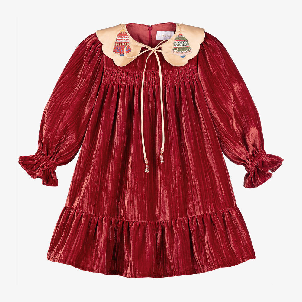 Gorgeous festive red dress for girls by EIRENE, made in lustrous velvet with a slightly textured, striped weave. It has pretty shirring across the bodice, gently elasticated, frilled cuffs on the long sleeves and a frilled hemline. It fastens with a discreet, concealed zip on the back. The dress comes with a beautiful, detachable, beige satin collar, beautifully embroidered, beaded and appliquéd with a bird, logo and bells. Prettily scalloped, it is secured with satin ties around the back of the neck.