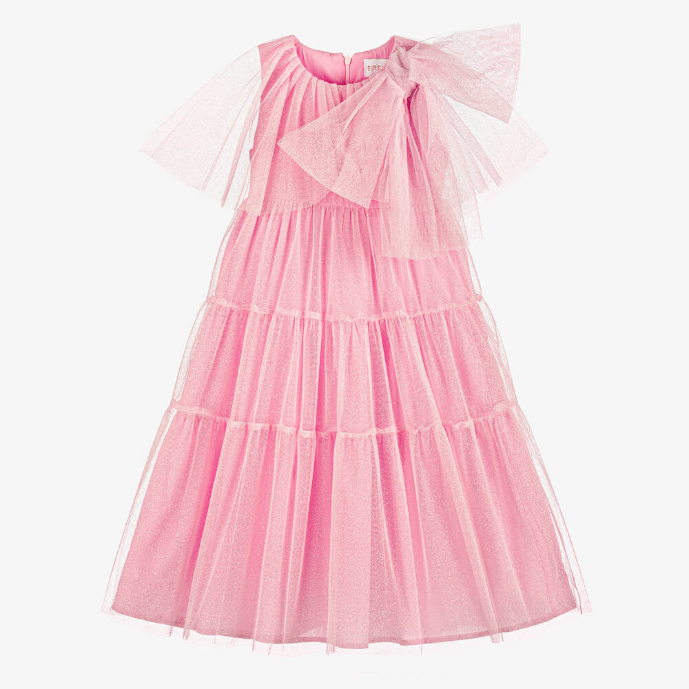 Pretty pink dress for girls by EIRENE, ideal for a party or special occasion. Made in the finest tulle with sparkly glitter flecks, this midi style has a sheer ruffle bow cape draping over the shoulders. The long, flowing skirt cascades into chic tiered layers. It is lined in soft cotton for comfort, and fastens with a concealed zip on the back.