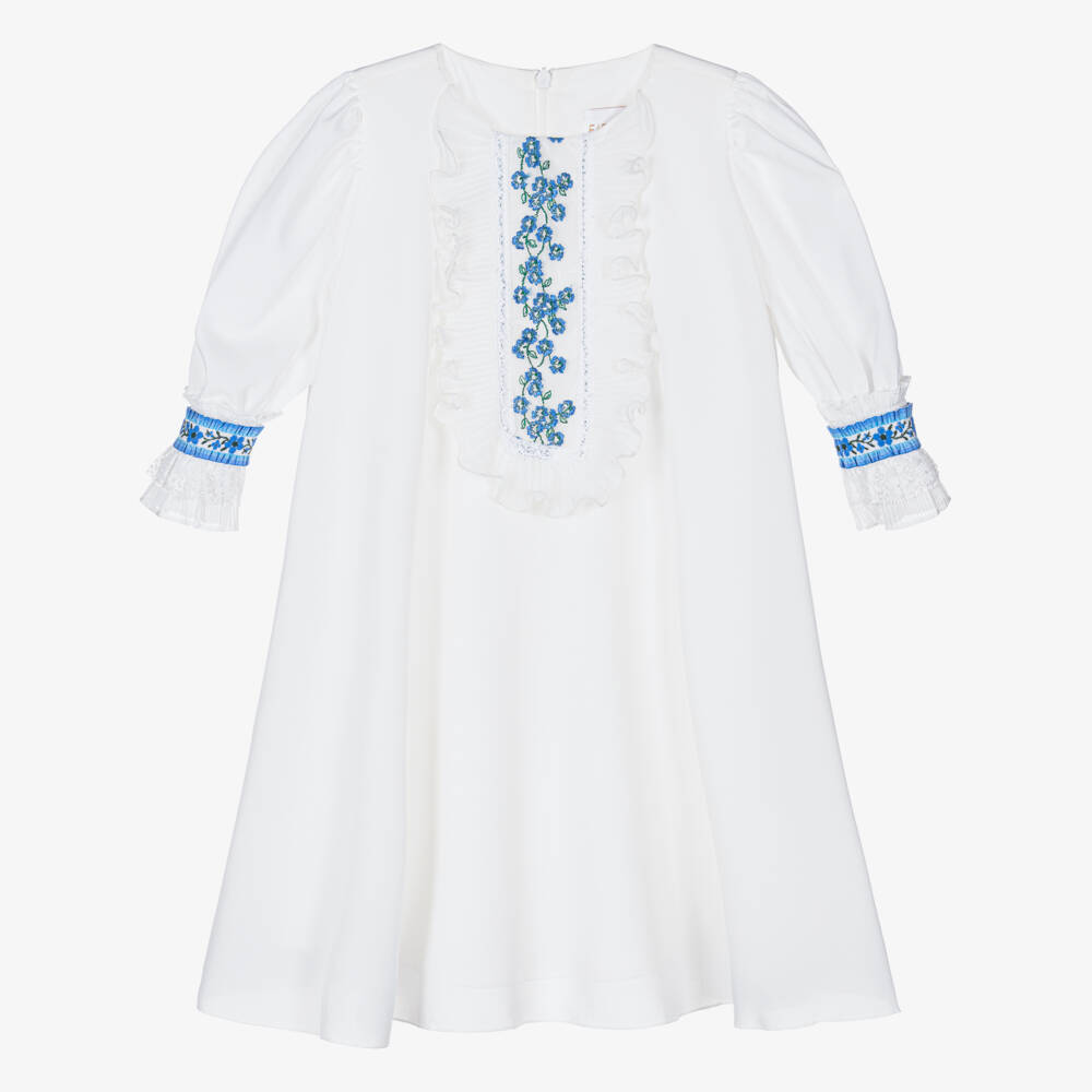 Chic white dress for girls by Eirene, woven in soft and lightweight chiffon. Lined in soft cotton, the front and lace-trimmed cuffs are embroidered with a delicate blue flowers for a timeless look. Fastening with a concealed zip on the back, this elegant dress has a relaxed, floaty shape for an effortless feel.