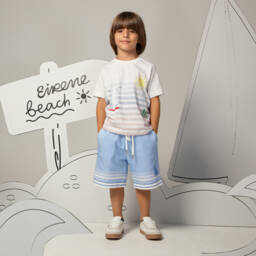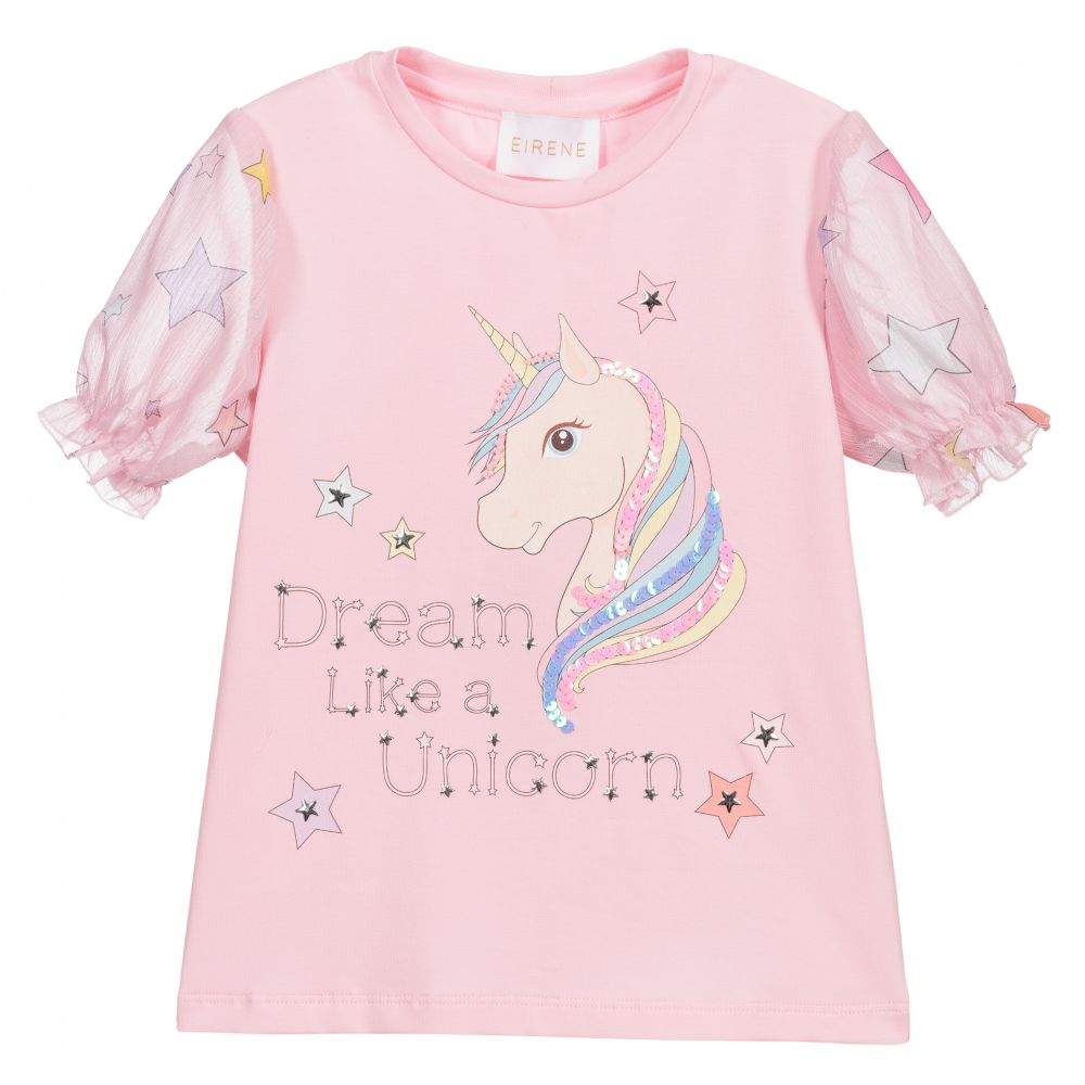 Pink T-shirt for girls by Eirene, made in soft and stretchy cotton jersey. It has chiffon sleeves, patterned with colourful stars and a sweet, pastel coloured unicorn print on the front, decorated with beads, sequins and silver stars.