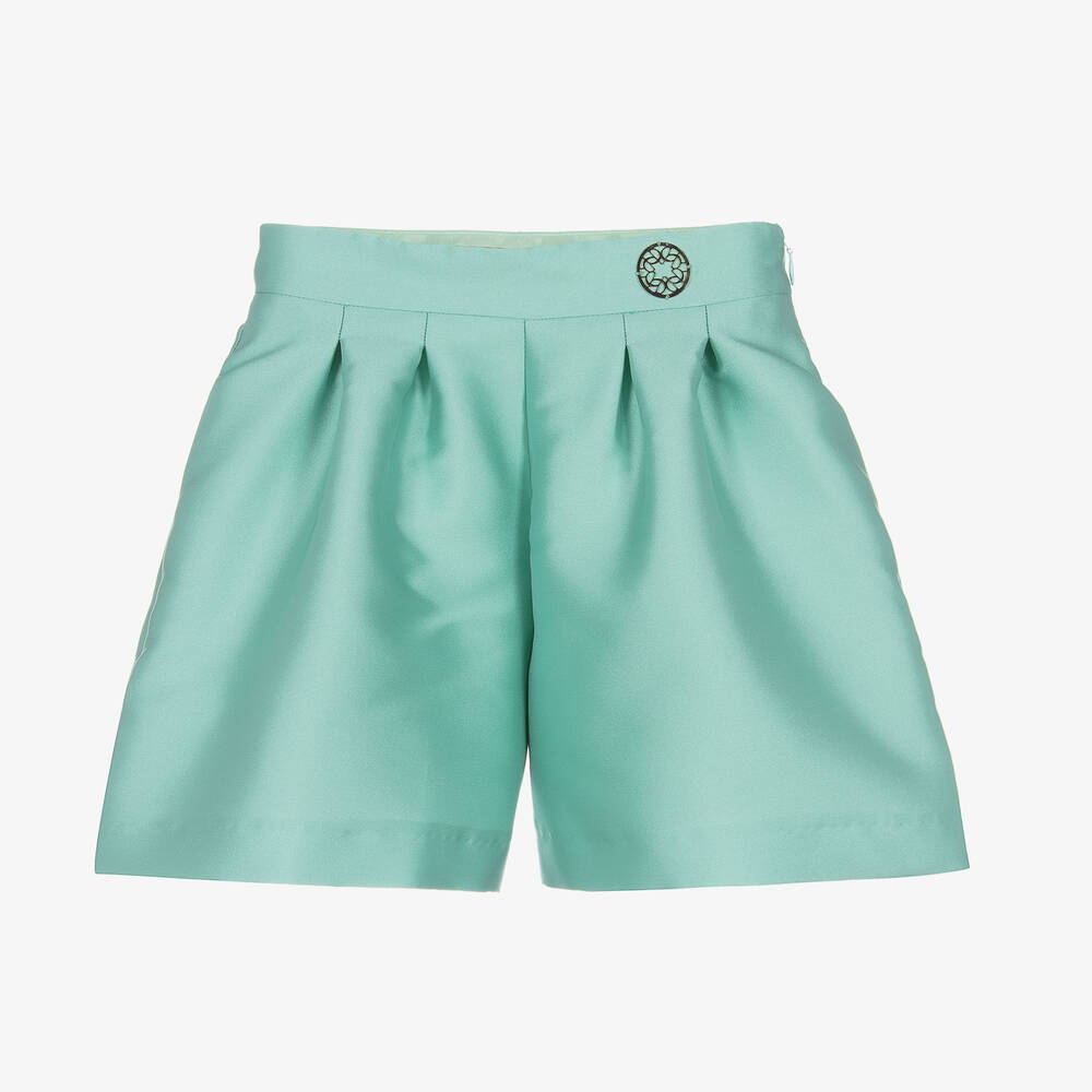 Beautiful aqua blue shorts for girls by luxury designer Elie Saab, made in an elegant silk blend duchess satin. Simply chic for smarter occasions, they are box pleated on the front, creating a lovely voluminous shape. The intricate gold metal monogram logo is stitched onto the front of the adjustable waistband for an added luxury touch. They are lined in silky satin with a seamless side zip fastening.