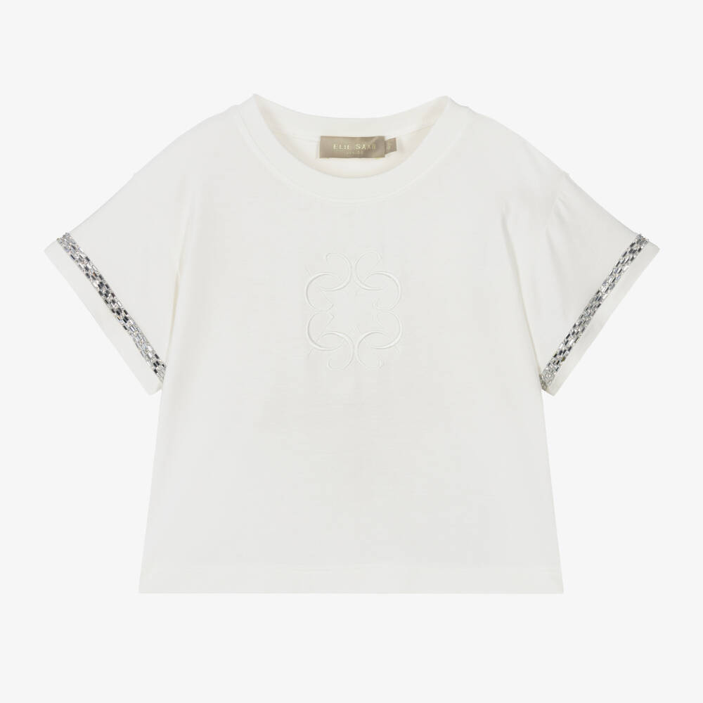 Ivory T-shirt for girls by stylish designer Elie Saab, made in luxuriously soft viscose jersey. With short sleeves and a boxy fit, it has a ribbed, crew neckline, an embroidered logo on the front and glittering bands of diamantés around the cuffs for a little sparkle.