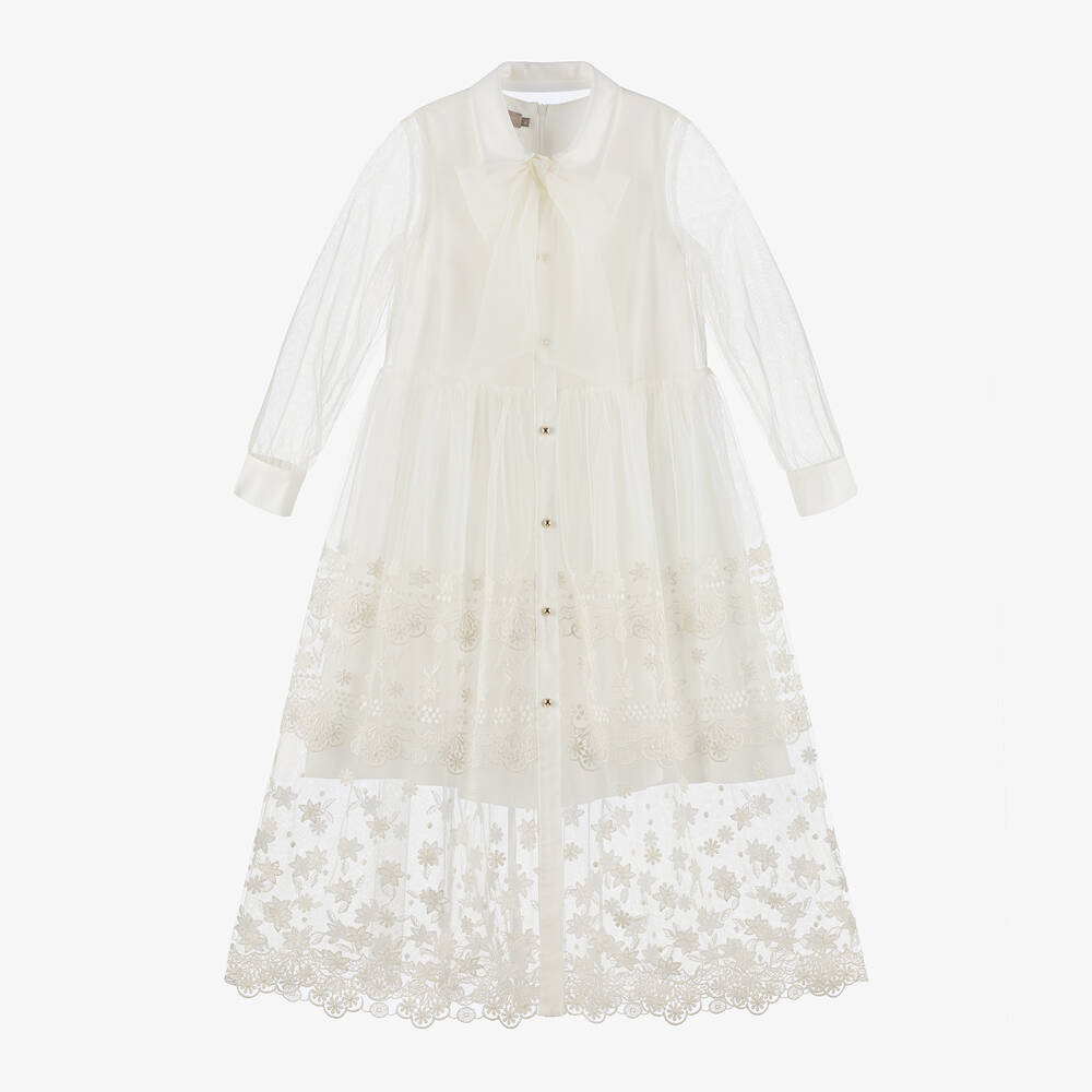 Designed by luxury couture label Elie Saab, this stunning ivory special occasion dress for girls offers timeless elegance. Made in the finest tulle, the collared bodice has sheer sleeves and a statement bow on the neckline. The gathered skirt has a floaty silhouette and exquisite lace-style embroidery surrounding the hem. The tulle layer fastens with chic gold buttons on the front and underneath sits a knee-length, cotton-blend shift dress lining, fastening with a seamless concealed zip on the back.