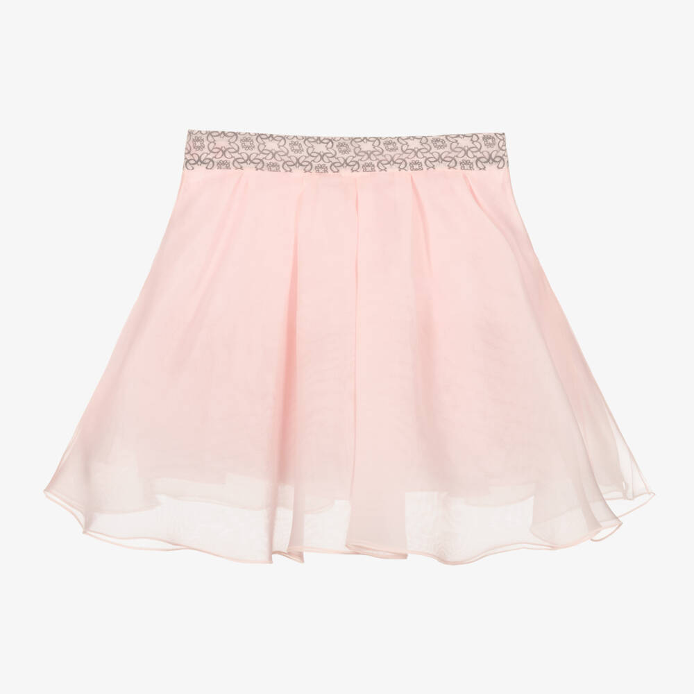 Beautiful pale pink skirt for girls by luxury brand Elie Saab, made in a double layer of lightweight silk organza. The waistband has a subtle logo pattern and is adjustable for the ideal fit. There is a tulle underskirt and a tulle frill on the voile lining to give the skirt lots of volume and a flared silhouette, just right for a special occasion. It fastens with a neat, concealed zip fastening on one side.