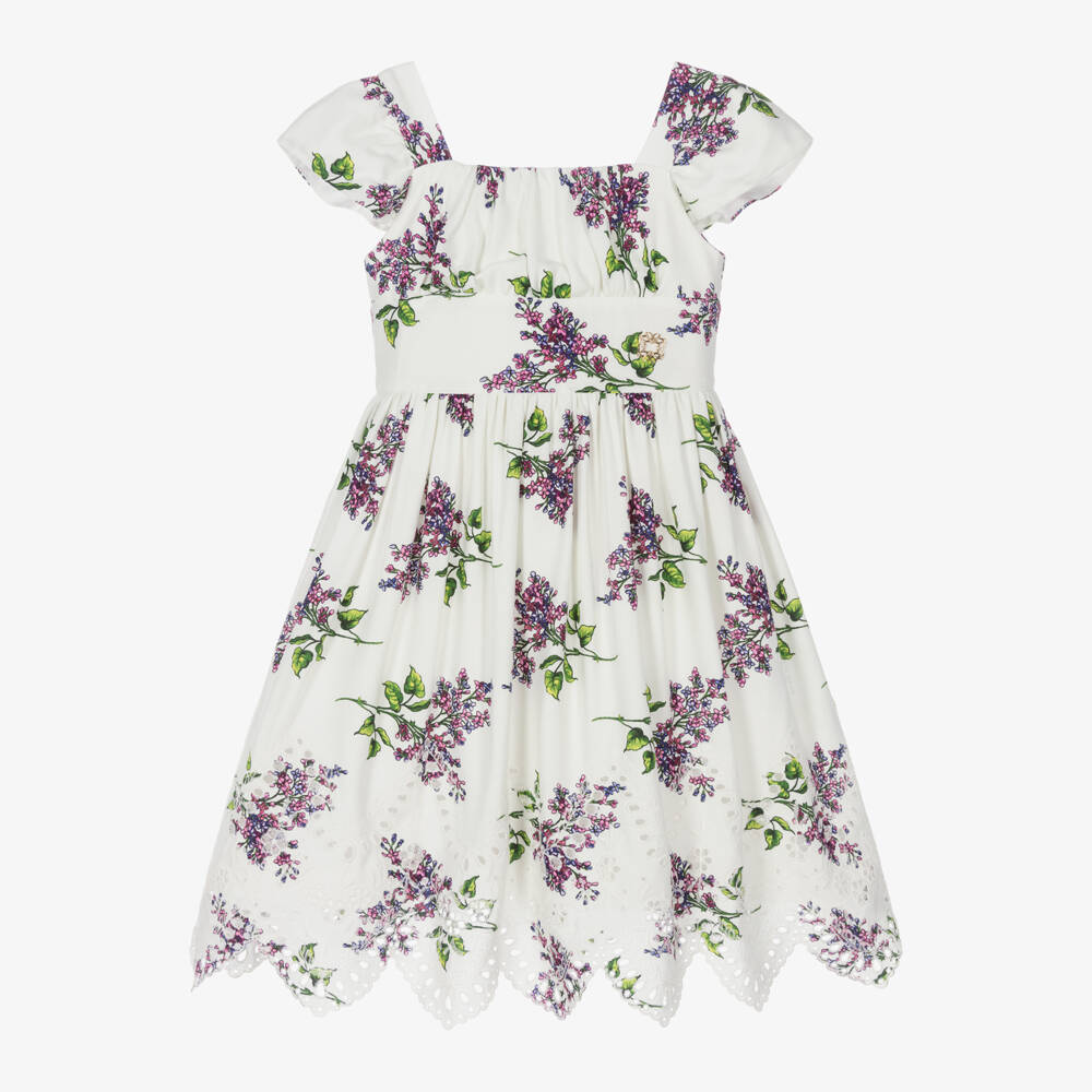 A pretty white dress for girls by luxury brand Elie Saab, made in satin crêpe with a subtle sheen. Dainty and delightful, it is patterned in a pink and lilac floral design with a scalloped broderie anglaise hem. It has a square neckline, capped flutter sleeved and a gold-tone charm embellishing the fitted waistline. Discreetly zipping up on the back, the bodice is lined in soft cotton voile with the skirt lined in a silky material.