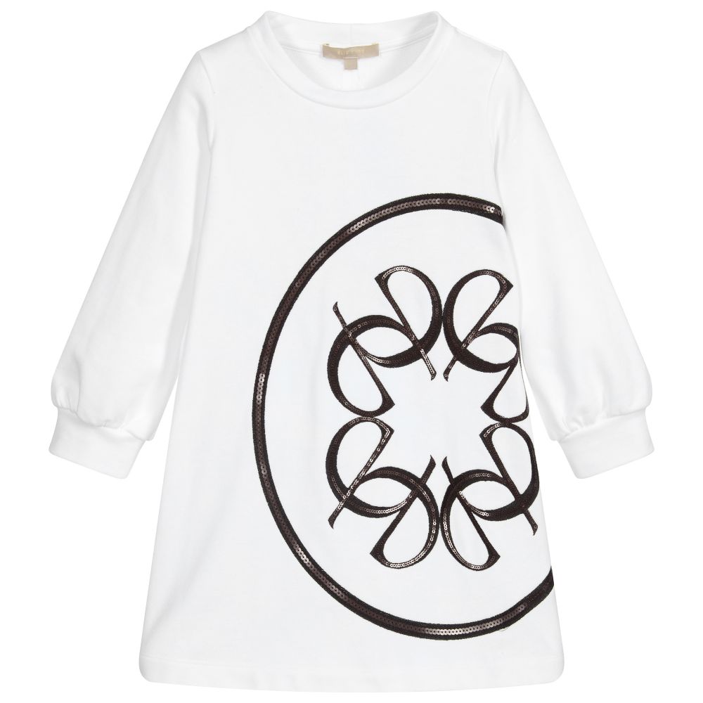 Girls white cotton jersey dress by luxury brand Elie Saab. The dramatic black logo is embroidered and embellished with matt sequins.