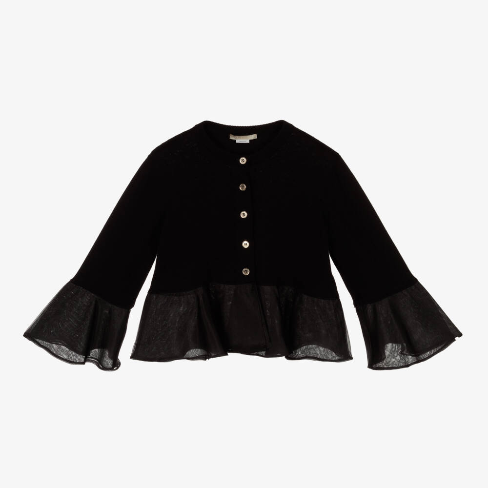 Black cardigan for teen girls by renowned couture designer, Elie Saab. This feminine and sophisticated design has double layers of fluted silk organza at the cuffs and hem and is finely knitted in soft cotton with gold buttons down the front to fasten.