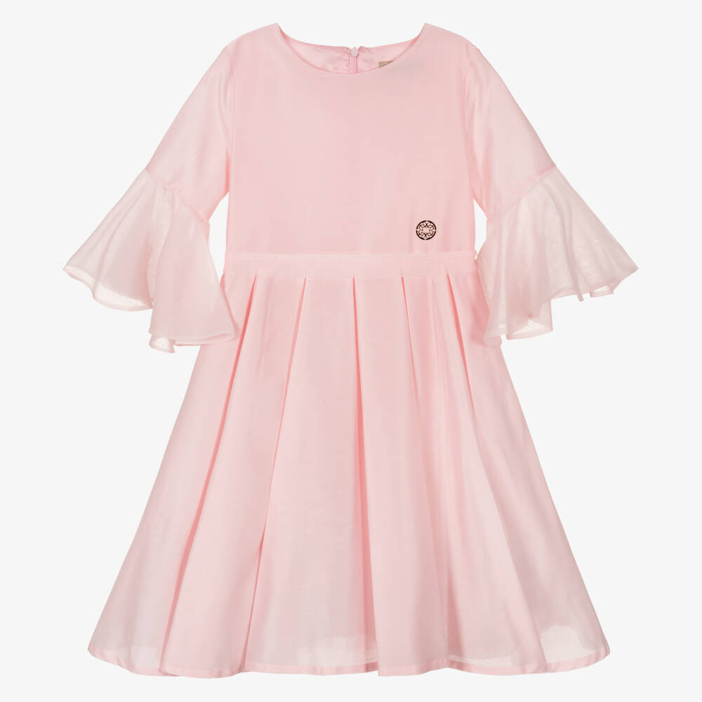 Pink special occasion dress for teen girls by Elie Saab, made in a luxurious silk and cotton blend. Simply elegant, the sleeves are trimmed with fluted silk organza to match the detachable waist sash. It is styled with a feminine box pleat skirt and a tulle underlayer to create a voluminous look. The dress has a satin lining and a neat concealed zip fastening on the back and the designer's signature metal logo is sewn onto the front for a discreet designer finish.